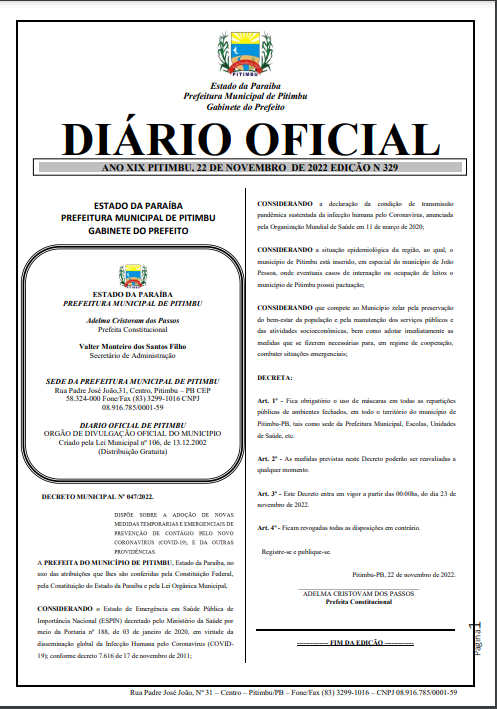 Diante do decreto recomenda-se o uso de máscaras de proteção facial, em todas as repartições públicas da cidade, incluindo escolas e unidades de saúde.